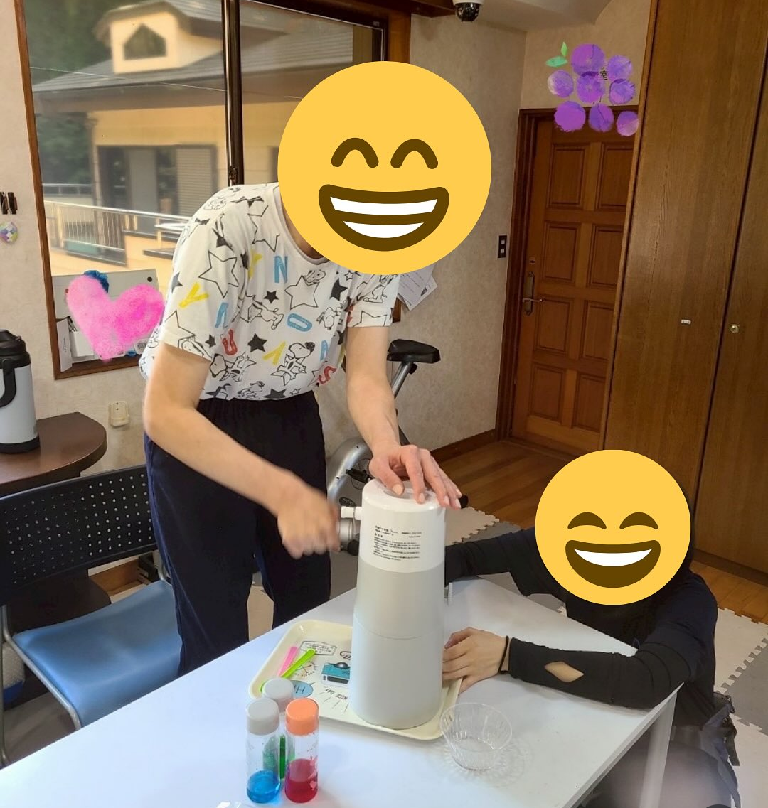 さらに、夏の定番といえば欠かせないのが「かき氷」。利用者の皆さまにも氷を削る体験をしていただき、シロップやトッピングを選んで自分だけのオリジナルかき氷を完成させました。冷たい氷のひんやり感に思わず笑顔が広がり、夏ならではの楽しみを五感で味わうことができました。